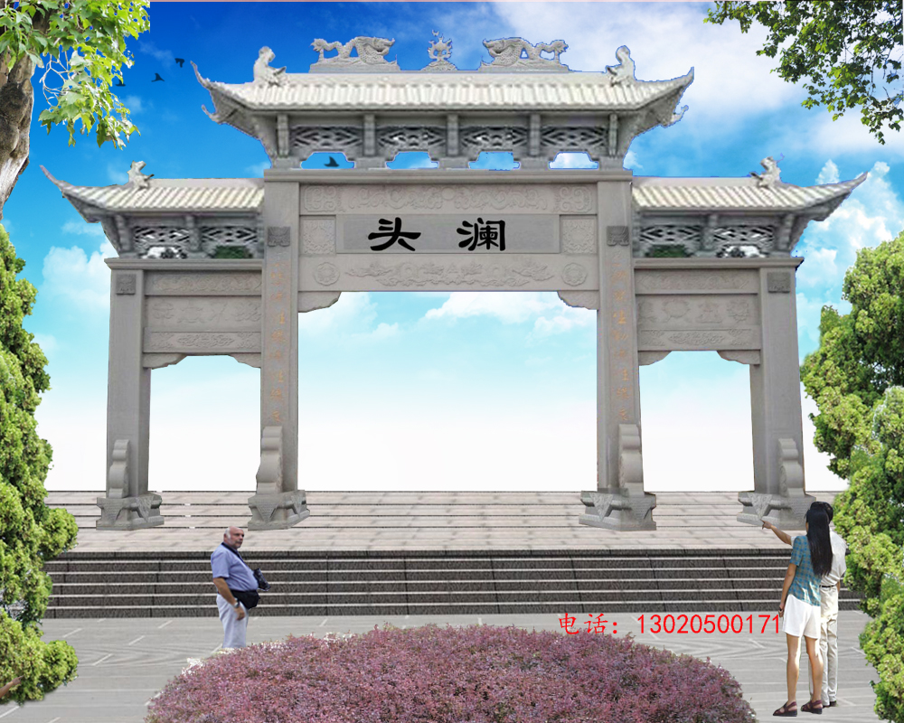 村口单门牌坊也称一门牌坊,单门石牌坊样式结构虽没有三门石牌楼复杂繁琐,但是不管是单门牌坊、三门牌楼甚至是五门大型石牌坊它们的雕刻艺术都是相通的,上面雕刻着吉祥图案的浮雕以及意境氛围的境界都是艺术文化的精髓,在村口修建一座单门牌坊可以使我们的村庄充满艺术气息。