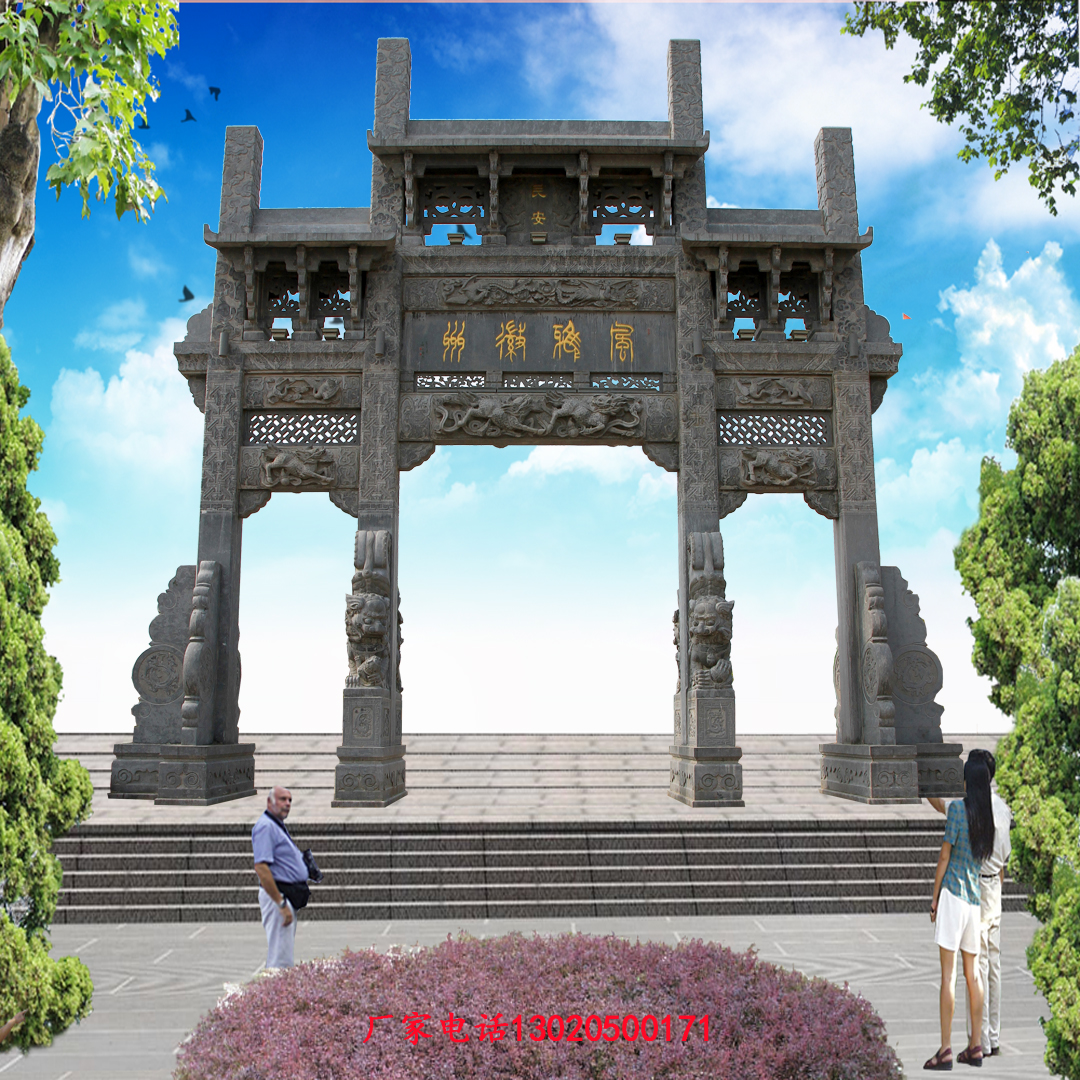 村口牌坊的造型变化非常多,主体看着基本一致,但是一些细节上面可以形成上百种变换。下面我们说一下,单门牌坊的常见造型,一门冲天式、一门一楼式、一门三楼式,三门石牌坊常见样式为:三门冲天式、三门冲天带楼式、三门三楼式、三门五楼式、三门七楼式,这些牌坊样式是我们经常制作的,也是我们生活中常见的几种样式。下面我们嘉祥县神画石雕有限公司就把这几种样式发布在下面供大家观看。